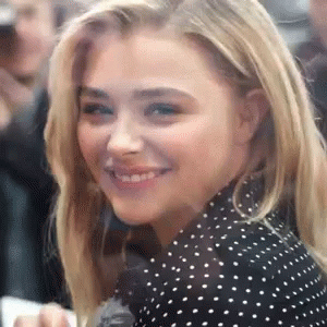 Chloe Moretz smiles and blows a kiss, wearing a stylish black and white polka dot shirt.
