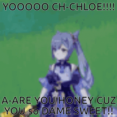 Keqing from Genshin Impact in a pixelated meme with the text 'YOOOOO CH-CHLOE!!!! A-ARE YOU HONEY CUZ YOU so DAME SWEET!!' referencing Chloe and Zoe.
