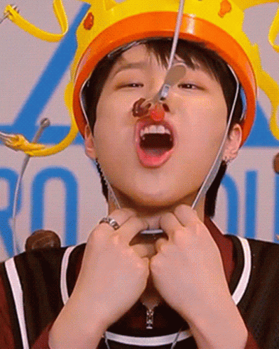 Cho Seungyoun, wearing a yellow crown helmet, attempts to eat a snack in a fun game.