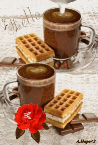 Two cups of chocolate coffee served with delicious waffles, chocolate bars, and a red rose, with 'Hello' written on the image.