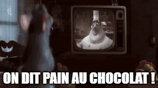 Hands pull apart a warm, flaky chocolatine, revealing its rich chocolate filling inside.