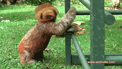A cute sloth with a head humorously resembling a chocolatine pastry, holding onto a green fence.