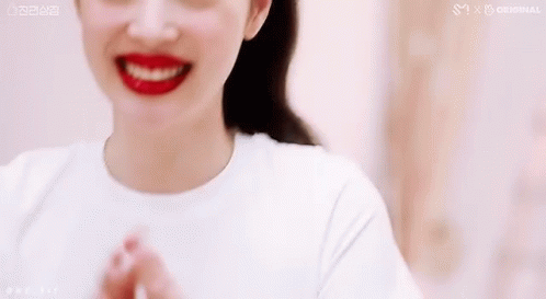 Sulli (Choi Jinri) smiles brightly and waves her hands, wearing a white shirt and red lipstick.