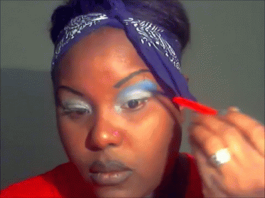 Woman with a blue bandana applies blue eyeshadow, demonstrating a Chola-inspired makeup look.