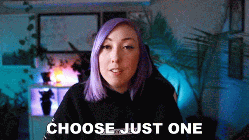 Ashnichrist, a woman with purple hair, speaks directly to the camera, urging viewers to 'Choose Just One'.