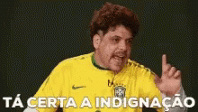 Man from Choque De Cultura in a Brazil jersey points, declaring 'The indignation is right'.