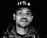 Chris Brown smiles and laughs heartily, wearing a 'USA' hat in this black and white clip, showing his joyful side.