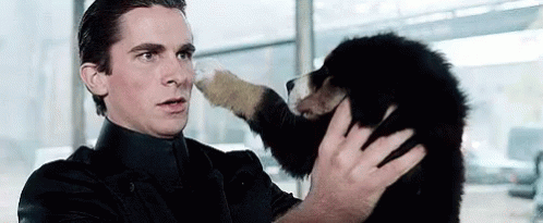 Christian Bale holds a small dog that playfully reaches its paw towards his face, showing a surprised expression.