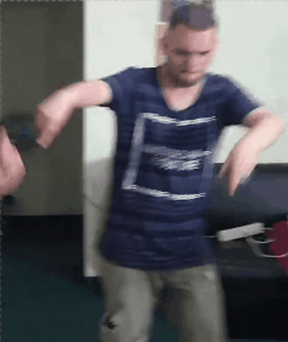 Christian De Lugano and Christian Lazaro dancing energetically in a blue striped shirt with 'Amsterdam Couture' text.