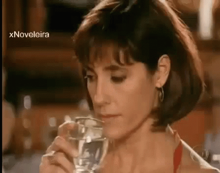 Christiane Torloni drinking water, looking up with an intense expression, from Xnoveleira.