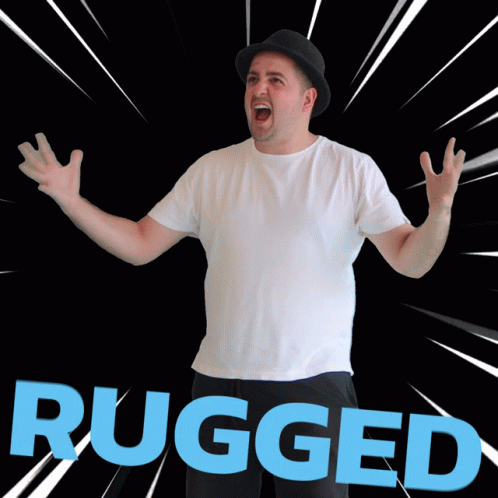 Christiangravias reacts with an exaggerated expression to the word 'RUGGED' on a black background.
