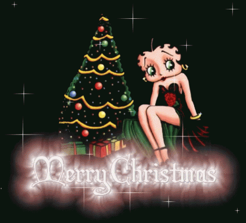Betty Boop sits by a Christmas tree, wishing everyone a Merry Christmas with sparkling text.
