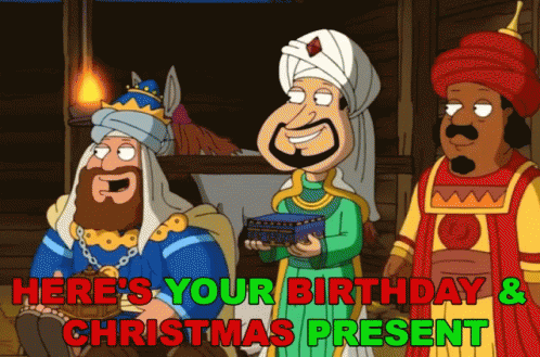 The Three Wise Men from Family Guy present a combined birthday and Christmas gift, perfect for December birthdays.