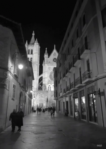 A black and white street scene with a grand cathedral at night, colorizing to reveal a Spanish holiday greeting.