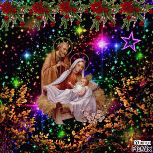 Mary, Joseph, and baby Jesus in a sparkling Christmas nativity scene with festive decorations.