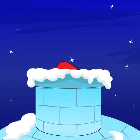 A cute Pudgy Penguin wearing a Santa hat and Christmas lights peeks from a snowy chimney.