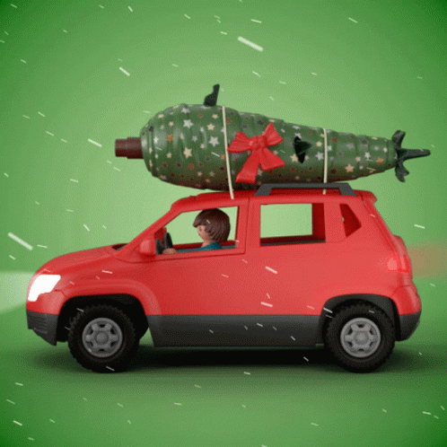 Animated red toy car with a Christmas tree on its roof, driving in falling snow.