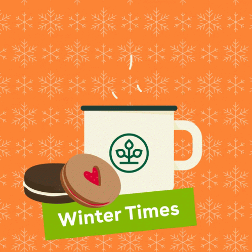 Animated scene with a steaming mug, cookies, and snowflakes, featuring changing text 'Winter Times' to 'Cozy Times'.