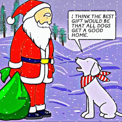 Santa Claus listens to a dog's Christmas wish for all dogs to find good homes.