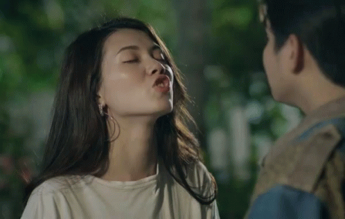 Nhi Katy makes a playful kissing face towards a man, captured in a sweet moment.