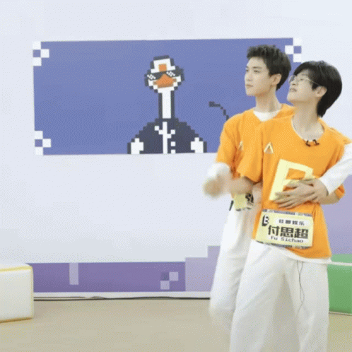 Zhang Teng and Fu Sichao from Chuang 2021 perform a synchronized dance routine, hugging and holding hands.