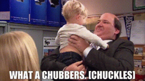 Kevin from The Office holds a baby, exclaiming 'What a Chubbers!' with a chuckle.