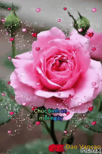 A beautiful pink rose with animated hearts and sparkles, wishing 'Chúc bình an mỗi ngày' (Wish you peace every day).