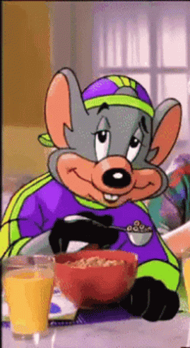 Chuck E Cheese looks shocked while eating cereal for breakfast.