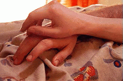 Chuck's hand intertwined with another's, resting on a patterned bedsheet in a tender moment.