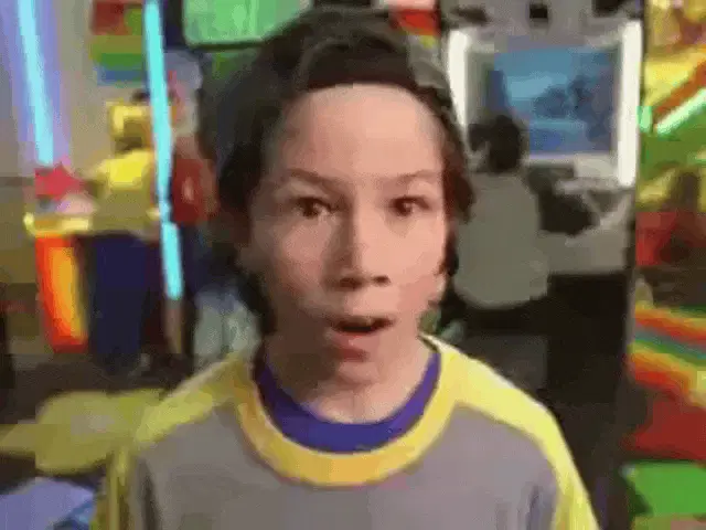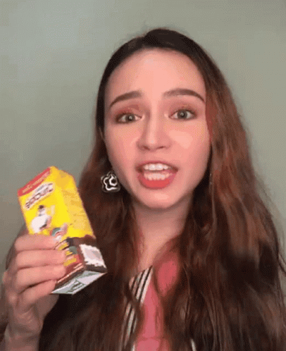 Isabelle Lazo reacts excitedly while holding a Chuckie chocolate drink box.
