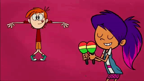 a cartoon girl is holding a pair of maracas next to a boy who is doing a handstand