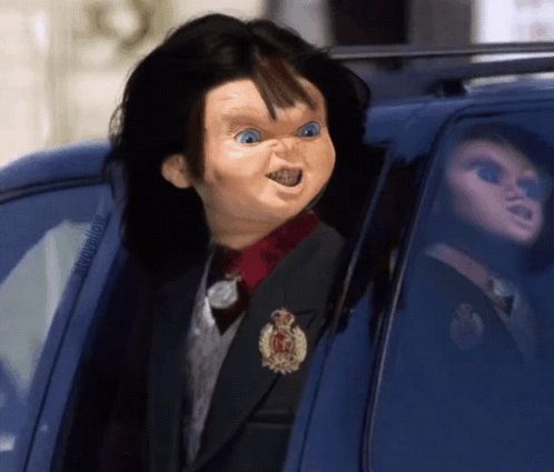 A Chucky doll edited to resemble Michael Jackson, wearing a suit and looking out of a car window.