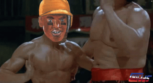 Chudds All Stars character with a superimposed face, resembling Jean Claude Van Damme in a Bloodsport scene.