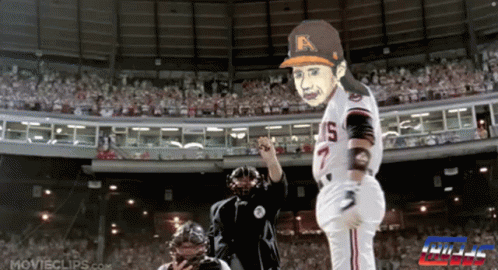 A Chudds All Stars baseball player from Major League, possibly Jemus Erd or Nostrildamus, points skyward in a stadium.