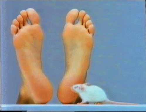 A white mouse interacts with human feet, possibly attracted by the 'smelly feet cheese' odor.