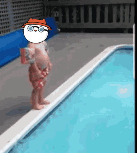 Chum Chums, wearing a hat and glasses, stands at the edge of a pool before falling in with a splash.