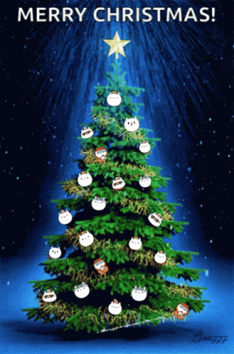 Chumchums NFT characters decorate a festive Christmas tree with a shining star and falling snow.