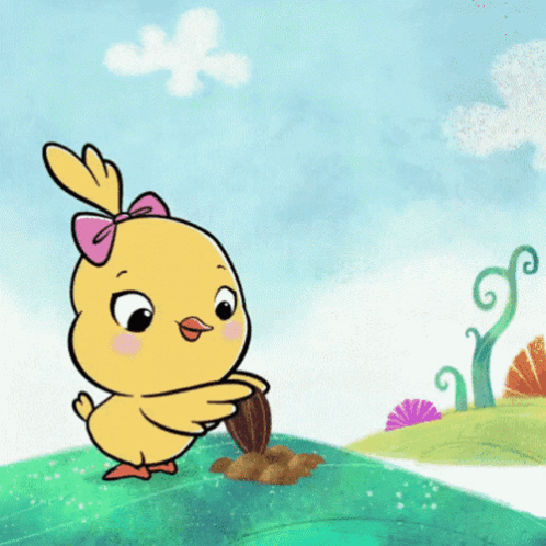 A cute yellow chick from Chums Chumchumsnft with a pink bow plants a seed that quickly grows into a beautiful daisy.