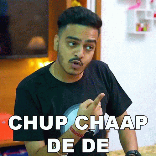 Rachit Rojha makes a funny face with the popular meme phrase 'Chup Chaap De De' displayed on screen.