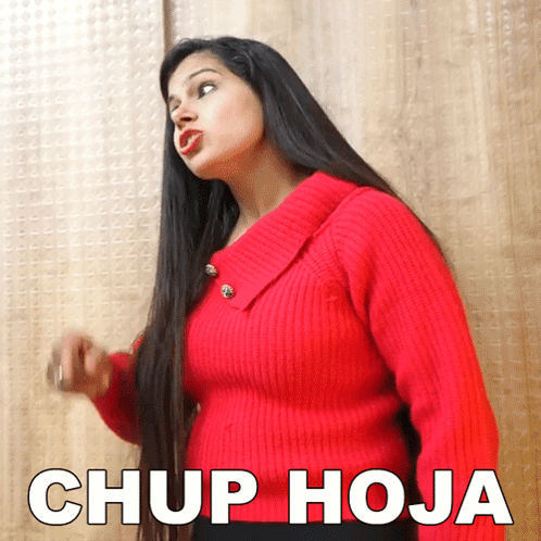 Sanjhalika Shokeen, in a red sweater, sternly tells someone to "Chup Hoja" (shut up) with a pointed finger.