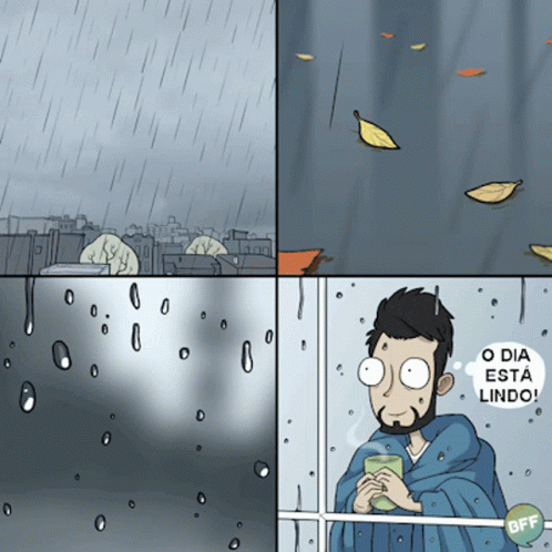 A man wrapped in a blanket enjoys a rainy day from his window, exclaiming 'The day is beautiful!'