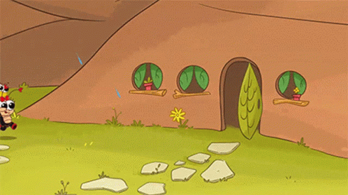 Bob Zoom characters, including a ladybug, bees, and ants, rush into their house to escape the sudden rain.