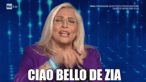 Italian TV host Mara Venier, wearing glasses and a purple top, smiles and says 'Ciao Bello De Zia' on screen.