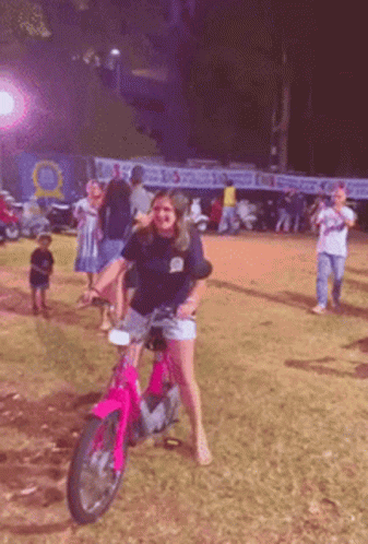 A woman proudly shows off her pink Ciao Piaggio moped at an outdoor event, wearing a shirt with a moped graphic.