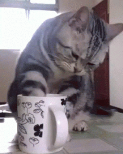 Cica the cat cleverly dips her paw into a mug and licks it, enjoying a drink.