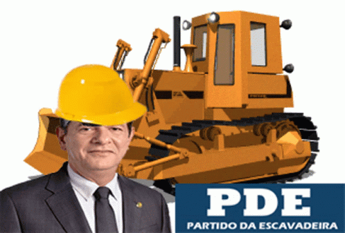 Cid Gomes, a Brazilian politician, stands in front of a large yellow excavator, associated with 'Partido Da Escavadeira'.