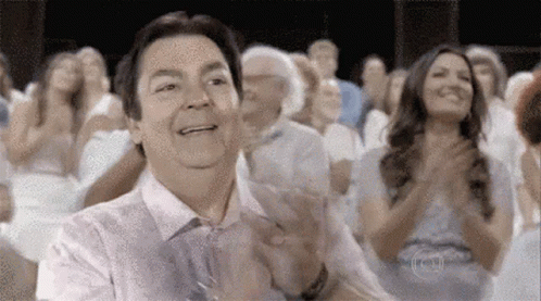 Faustão and a cheering crowd celebrate Cidāo, with 'Parabéns Cidāo' displayed on screen.