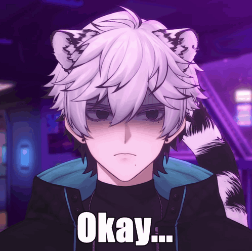 Cielwave, a white-haired tiger VTuber, gives an awkward 'Okay...' with a slight blush.