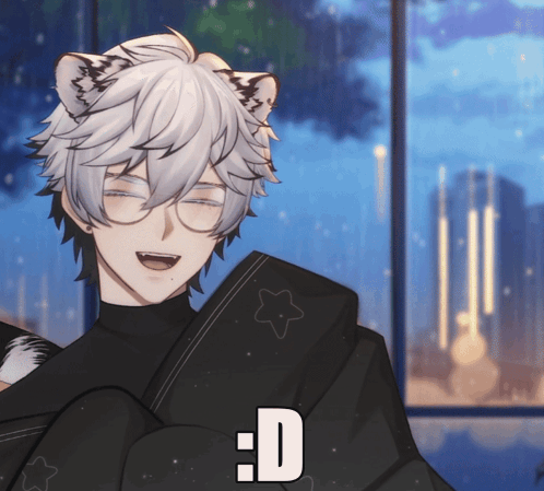 Cielwave, the white tiger VTuber, laughs happily with his tail wagging, showing a joyful expression.