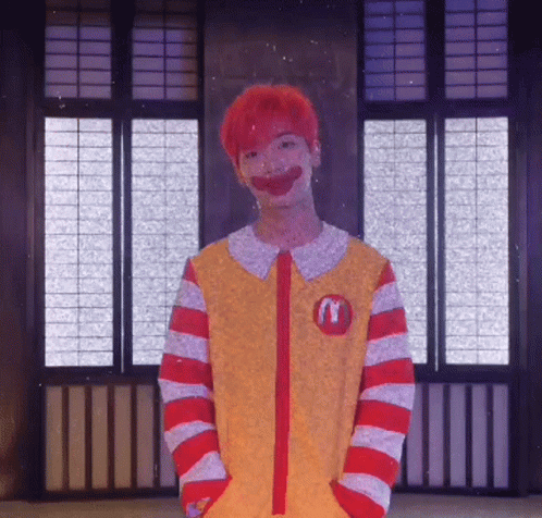 Ciipher's Won (Park Sungwon) dressed as Ronald McDonald, waving and smiling in a festive setting.